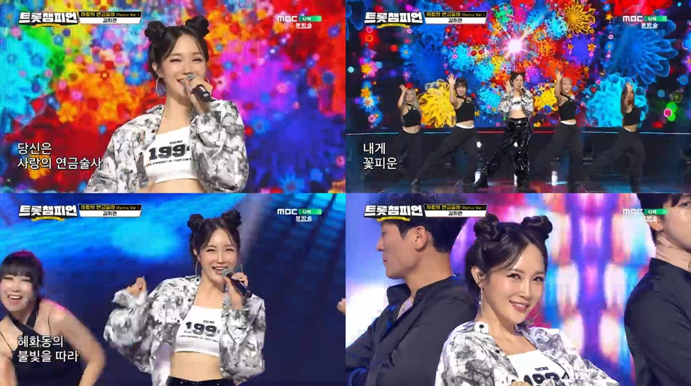 김지현은 지난 29일 방송된 MBC ON '트롯챔피언'에 출연해 '사랑의 연금술사 (Remix ver.)' 무대를 선보였다.